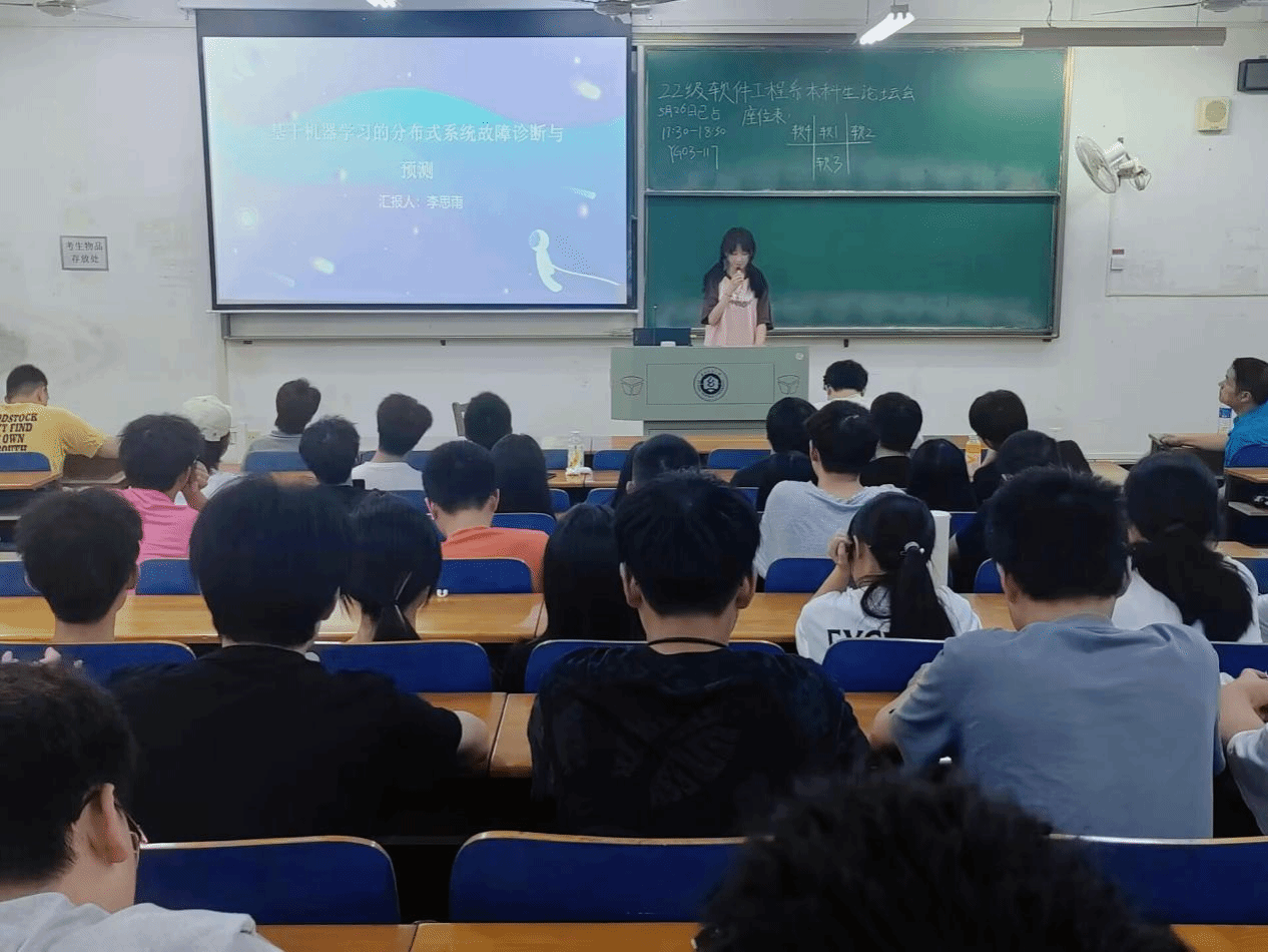 2022级软件工程专业的李思雨同学详细介绍了她参与的项目“基于机器学习的分布式系统故障诊断与预测”,首先介绍了项目的背景,然后分享了整个项目的设计流程。她还详细分析了项目的最后成果,并进行了现场运行演示,激发了同学们的极大兴趣。最后,她给大家分享了一些日常学习使用的资源,并强调持续学习是一切的基石,只有不断提升自我才能跟上技术发展,解决复杂工程问题需要系统思维能力,最后一定要动手实践,将理论付诸实践中。