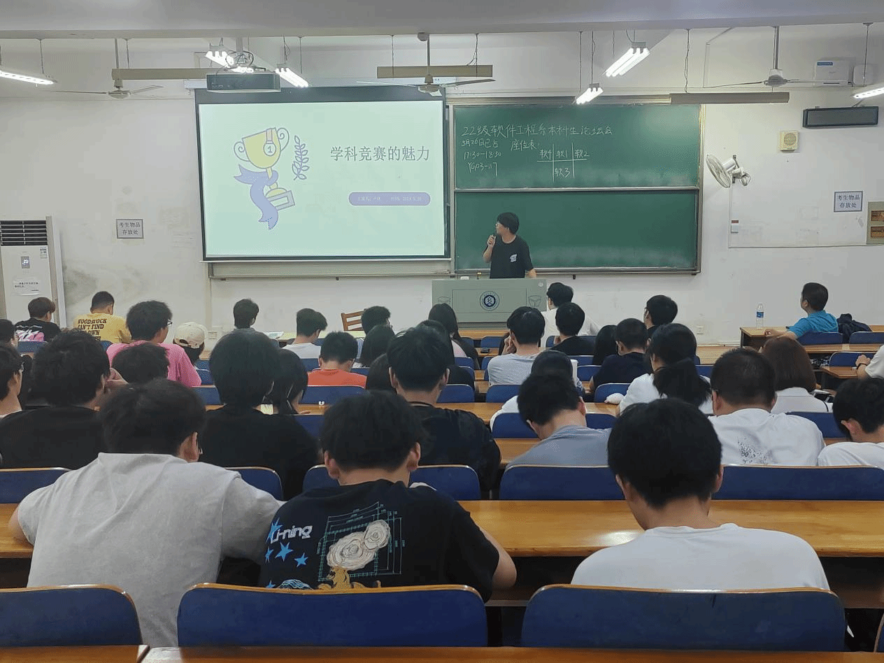 2022级软件工程专业的卢佳同学从竞赛角度为大家讲解其中的魅力与好处。首先,他从实践经验、团队协作、职业发展、创新思维四部分为大家讲解了竞赛的重要性,并罗列出我们现阶段可以关注的一些比赛。随后他通过详细讲解和介绍自身参加过的机器人足球比赛和数学建模比赛并从涉及学科到组队要求,赛前准备等方面为大家提供了参赛建议。最后,他表示,从大一的小白,到现在具有一定的科学素养,他只是一直在坚持,坚持参加竞赛,坚持暑期留校学习,每一个竞赛的经历都在不断提升他的能力,最后塑造成现在的他。一番肺腑之言让大家真切地感受到了竞赛的魅力。