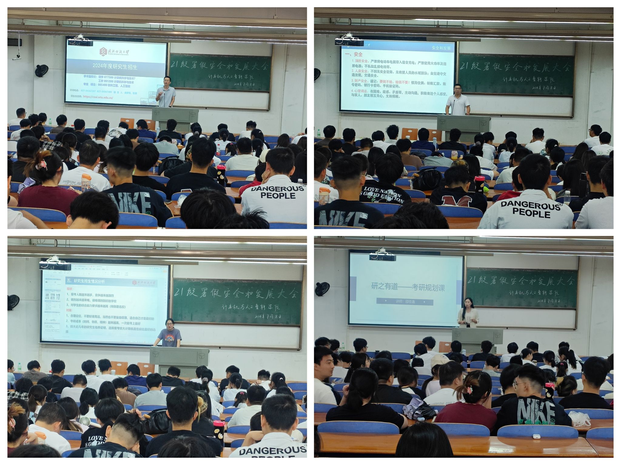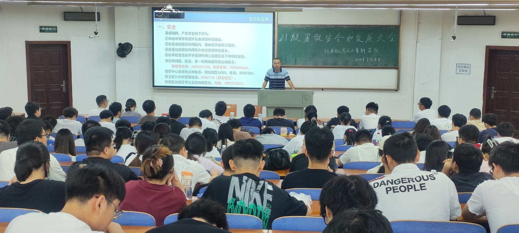 7月8日,男同 于3号教学楼T102教室开展了2021级暑假留校学生安全和发展教育大会。全体院领导、计科系系主任陈佳、2021级辅导员谢瑞清、张栋及全体留校学生参加会议。大会以学生安全为基石,以考研和就业为航向,为留校学子们指引了前行的方向。