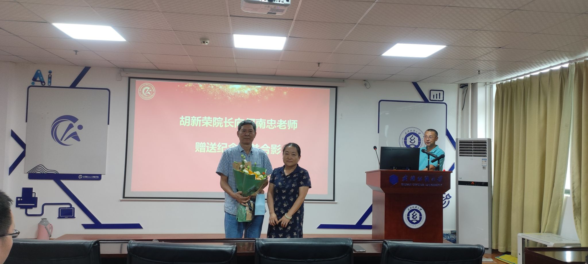 何老师在发表荣休感言时,感慨万分,对学院的培养和同事们的支持表示感谢。同时回顾了自己在教育岗位上的点点滴滴,表达了对学院、同事和学生的深厚情感,并表示一定会继续关注学院发展,尽自己所能继续为学院做贡献。随后,院长胡新荣为何老师赠送了纪念品,并与何老师合影留念,记录下这一难忘的时刻。