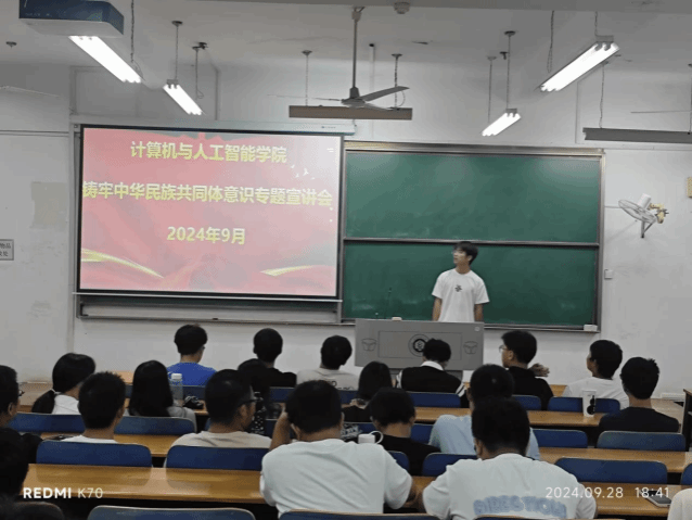 9月28日下午,学院在三栋教学楼举行了铸牢中华民族共同体意识专题宣讲会,24级新生辅导员首先从我国的民族介绍开始,回顾了中华民族的光辉历史,强调我国民族在政治上团结统一,文化上兼容并蓄,经济上相互依存,情感上相互亲近,其中还特别提到了中华民族共同体意识对于国家统一,民族团结和社会和谐的重要性,紧接着,辅导员开始就我们青年该如何践行和培养中华民族共同体意识展开论述,他鼓励我们可以积极参与到民族团结的实践中去,时刻怀有浓郁的民族情感和爱国情感,推动中华民族走向包容性更强,凝聚力更大的命运共同体。