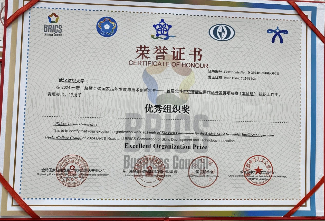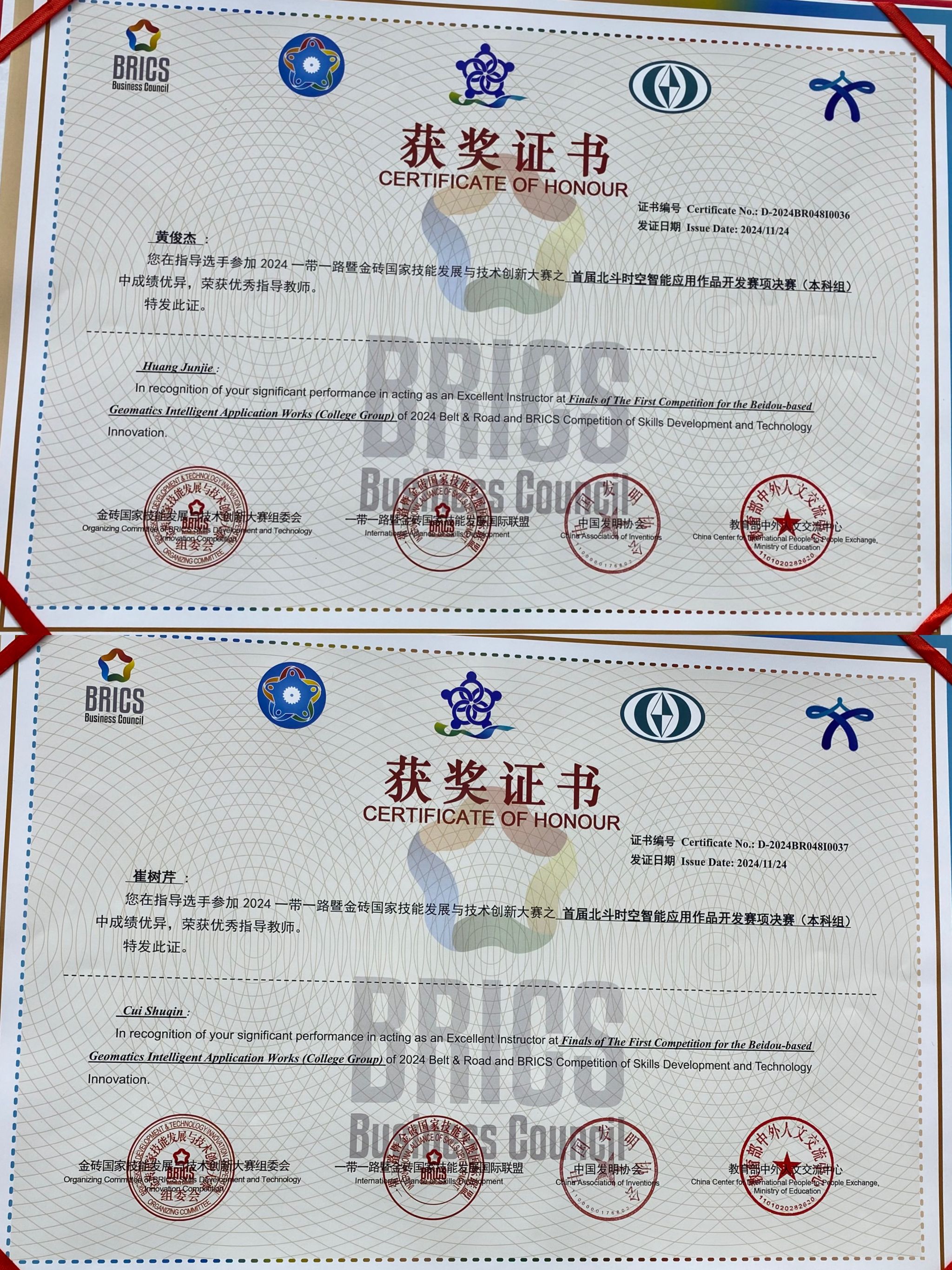 近日,由金砖国家工商理事会中方理事会、一带一路暨金砖国家技能发展国际联盟、中国科协“一带一路”暨金砖国家技能发展与技术创新培训中心主办的“2024一带一路暨金砖国家技能发展与技术创新大赛首届北斗时空智能应用作品开发赛项”决赛在武汉圆满落幕。男同 学子在此次比赛中表现优异,荣获国家级二等奖,为学校争光添彩。