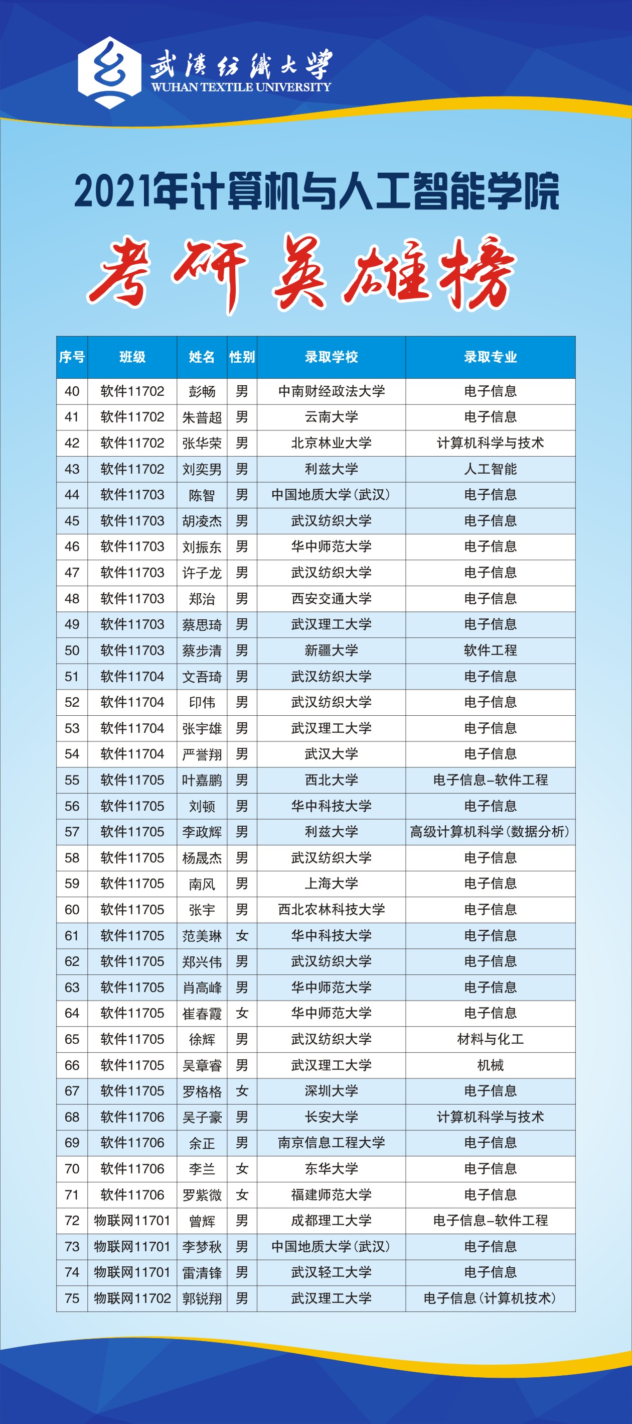 男同 是男同 规模较大,整体实力雄厚的院部之一。学院现有教职工90人,其中专业教师68人(高级职称37人,具有博士学历38人),是一支朝气蓬勃、富有潜力的教学科研团队。拥有全国优秀教育工作者、“湖北省名师工作室”、湖北省“程序设计课程群”教学团队、湖北省师德先进个人、“纺织之光”教师。现在校本科生1870人、研究生近200人。胡新荣教授获批“湖北名师工作室”主持人,16级张春帅同学是全国“自强之星”。