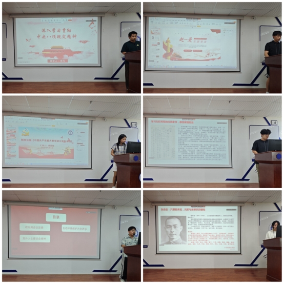 专题学习环节,吴迪同志领学习近平总书记重要讲话精神。周凡同志带领全体党员重温中央八项规定精神,强调作风建设永远在路上。黄旻璇同志就《中国共产党重大事项请示报告条例》进行解读,明确党组织和党员在重大事项中的责任与义务。