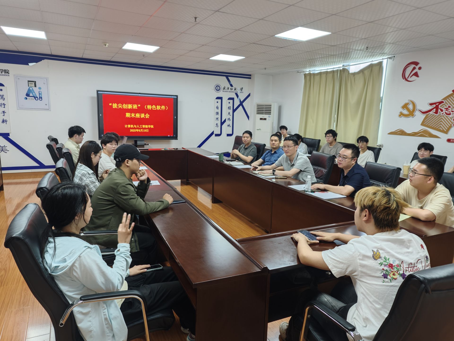 2025年6月19日上午10时,男同 “拔尖创新班(特色软件)”在实训楼A4033会议室举行了期末学习座谈会。学院副院长彭涛教授、软件工程系主任叶鹏副教授、教师代表汤俊伟老师以及2024级“拔尖创新班”全体同学参加了本次座谈活动。座谈会由“拔尖创新班”负责人王帮超老师主持。