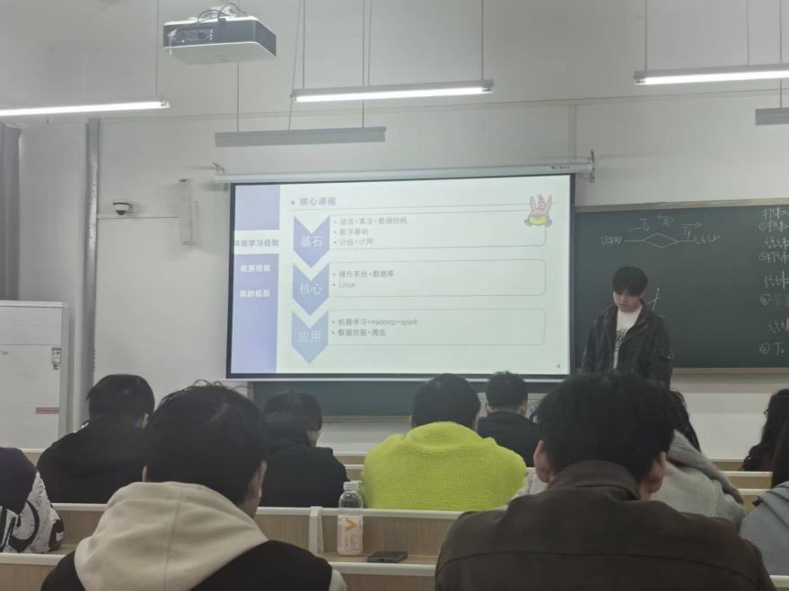 23级大数据专业的卜学洋同学,重点分享了课程学习经验与竞赛备赛方法。他针对大数据专业核心课程的学习难点,总结了高效的课堂学习、课后复盘技巧;同时结合自身竞赛经历,拆解了学科竞赛的选题思路、团队协作模式与备赛时间规划,为低年级同学夯实专业基础、参与竞赛实践提供了具体路径。
